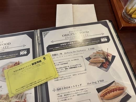 セットみたいについてくる謎は食べ物と飲み物を 1 : 1 で注文すると謎がプラスされる。