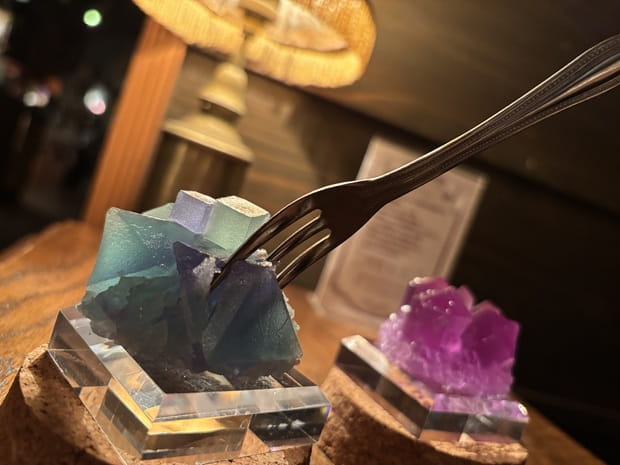 そこに加えて何品かフードがある。フードは特にクセがあり、食べられる鉱石だとか世界一甘い…何か、よくわからん長いカタカナのお菓子があった。それは世界で 2番目に甘い物との食べ比べセット商品とのこと。土日限定でチーズケーキもあるらしい。