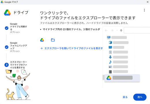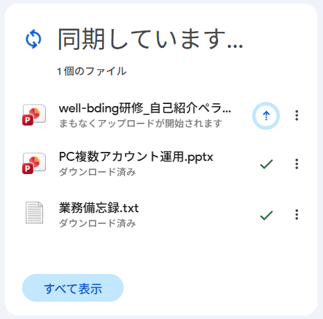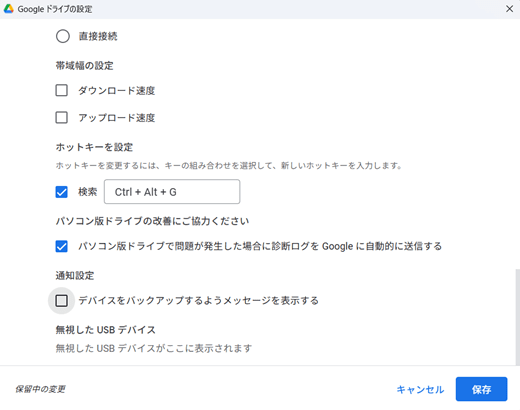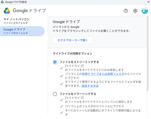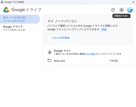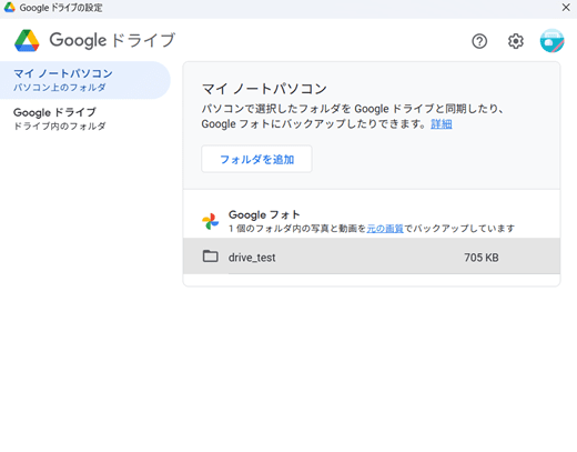 ここでフォルダを選択すると定期的に PC から Googleドライブへファイルがアップロードされるようになる。