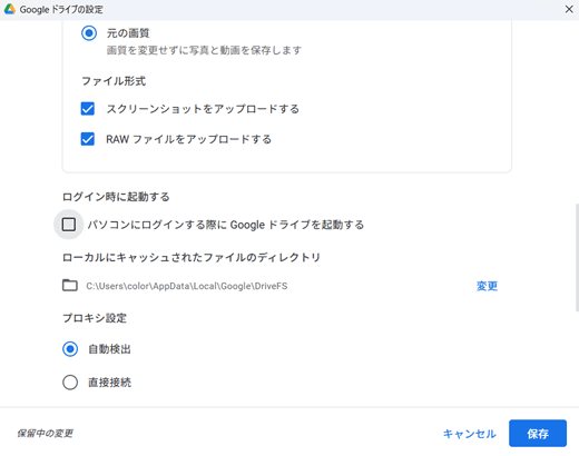 ログイン時に起動する欄の “パソコンにログインする際に Googleドライブを起動する” からチェックを外す。これでパソコン起動時に Googleドライブが開かれる事が無くなる。