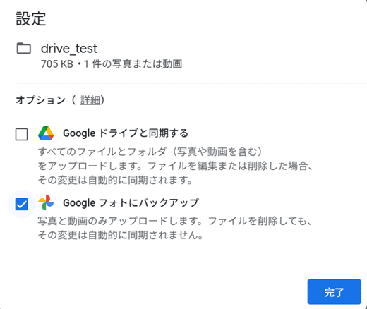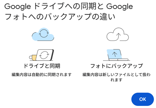 次に Googleフォトに同期するフォルダの選択画面が表示される。ドライブと同期する事との違いは以下の通り。