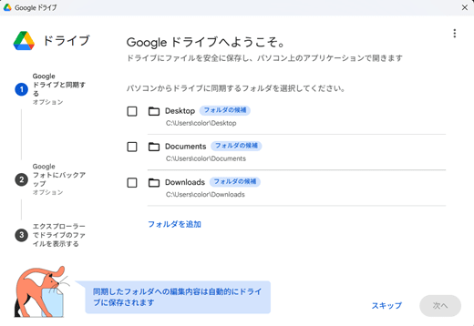すると、PC から Googleドライブに同期するフォルダの選択画面が表示される。