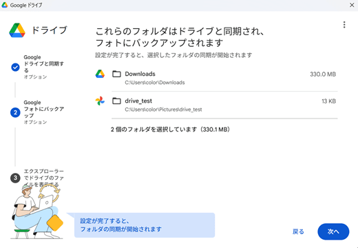 同期フォルダを設定して先に進むと画像のような確認画面が表示される。