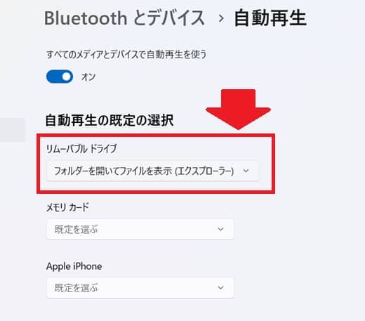自動再生の設定画面へ遷移したらリムーバブル ドライブの設定を変更しよう。