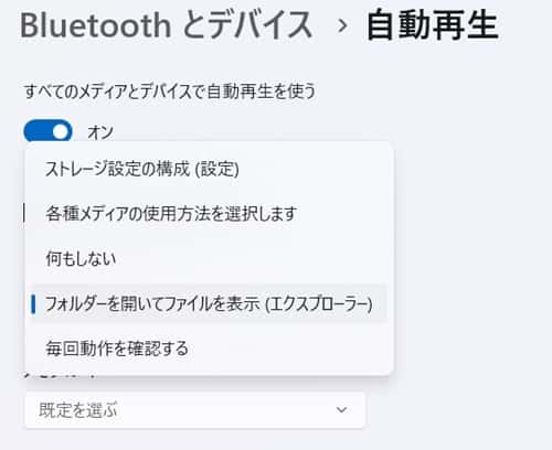 USBメモリを挿入してエクスプローラーが自動で開く PC の場合、ここが “フォルダーを開いてファイルを表示 (エクスプローラー)” となっているはずだ。